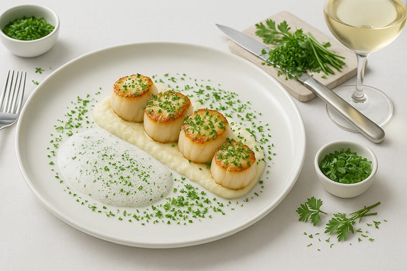 Scoici Saint-Jacques aromatizate cu fines herbes, pe pat de piure de țelină cu spumă de vin