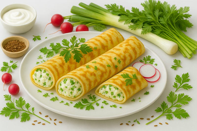 Clătite cu brânză proaspătă, praz și hasmațuchi